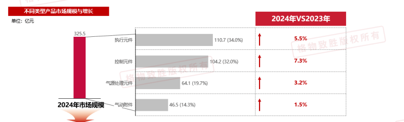 气动元器件市场2024年中国市场业绩约为325.5亿元,较去年同比5%左右的增长,行业需求依赖下游制造业,汽车制造尤其是新能源汽车和电子元件加工如电子半导体行业贡献主要增量,另外受工业自动化程度提升、国产替代政策推动的影响,整体保持较为稳定的增长。