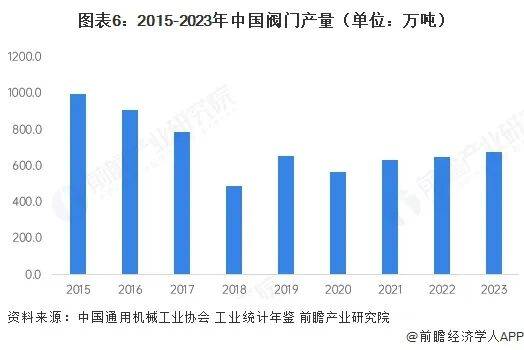 2015-2018年,受到主流需求市场疲软、行业竞争加剧等因素影响,中国阀门产量呈现下降趋势,2018年为486.3万吨,为近年来最低点。2019年以来,中国阀门产量维持在560-700万吨之间,2021年以来产量呈现小幅上升趋势。初步统计,2023年中国阀门产量在679万吨左右。