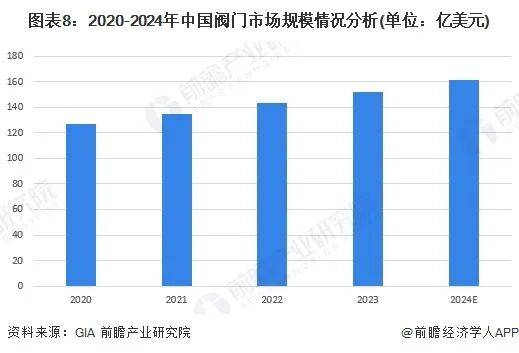 受益于工业发展、城市建设以及全球经济一体化,中国阀门制造行业得到了迅速发展。近年我国阀门行业在市场规模和技术水平方面均取得了显著进步,但仍存在高端产品依赖进口。根据GIA的数据,2023年国内阀门市场规模为152亿美元。初步统计2024年中国阀门市场规模突破160亿美元。