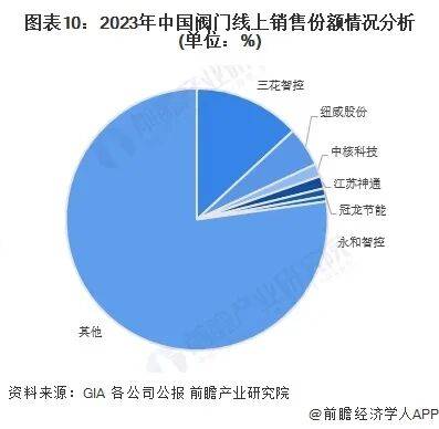 2023年中国阀门市场规模约为152亿美元,结合中国阀门制造行业主要上市企业阀门制造业务收入数据计算获得,2023年三花智控作为制冷空调阀门领域的龙头企业,市场占有率在13%左右;纽威股份的市占率也达到了5%左右。